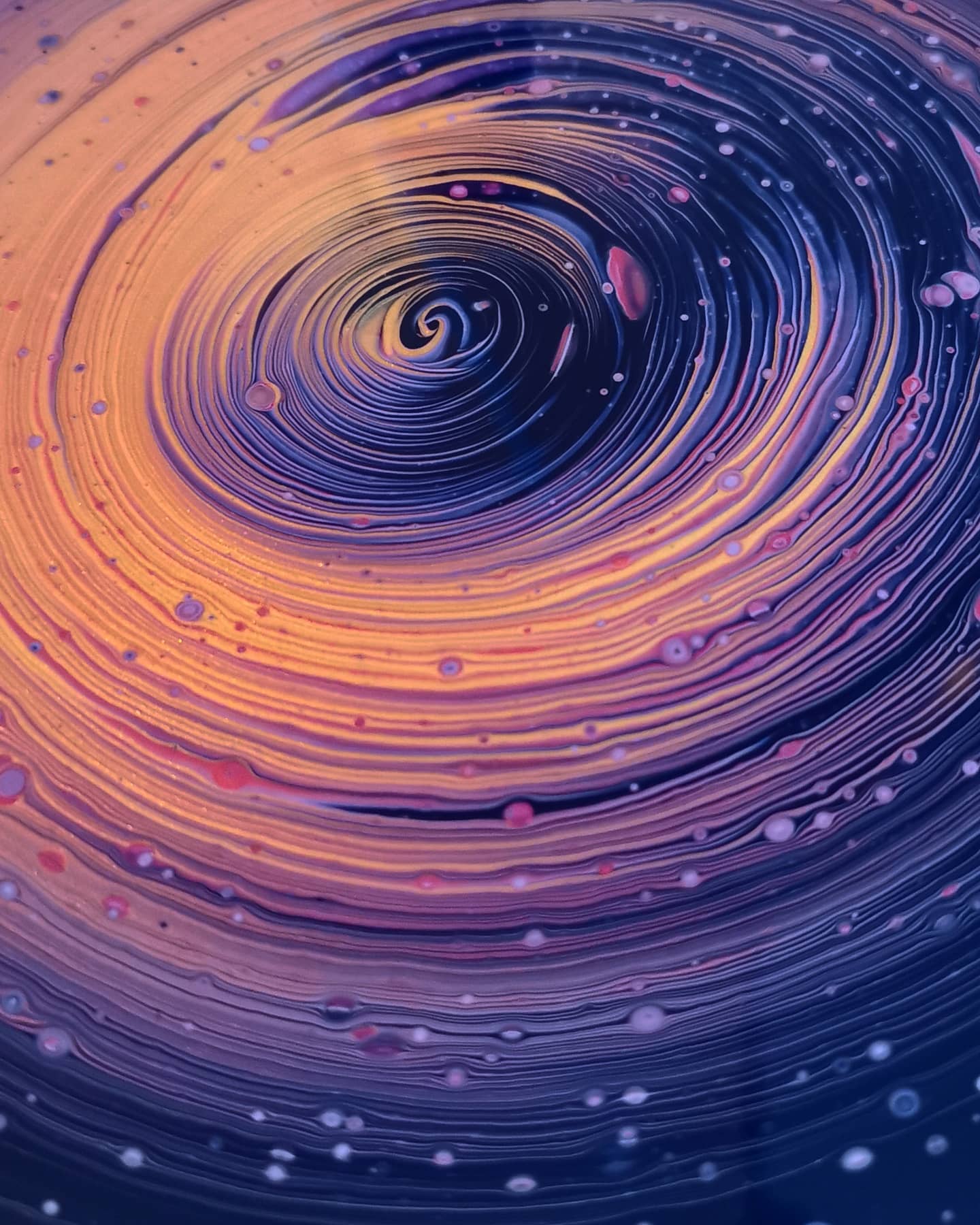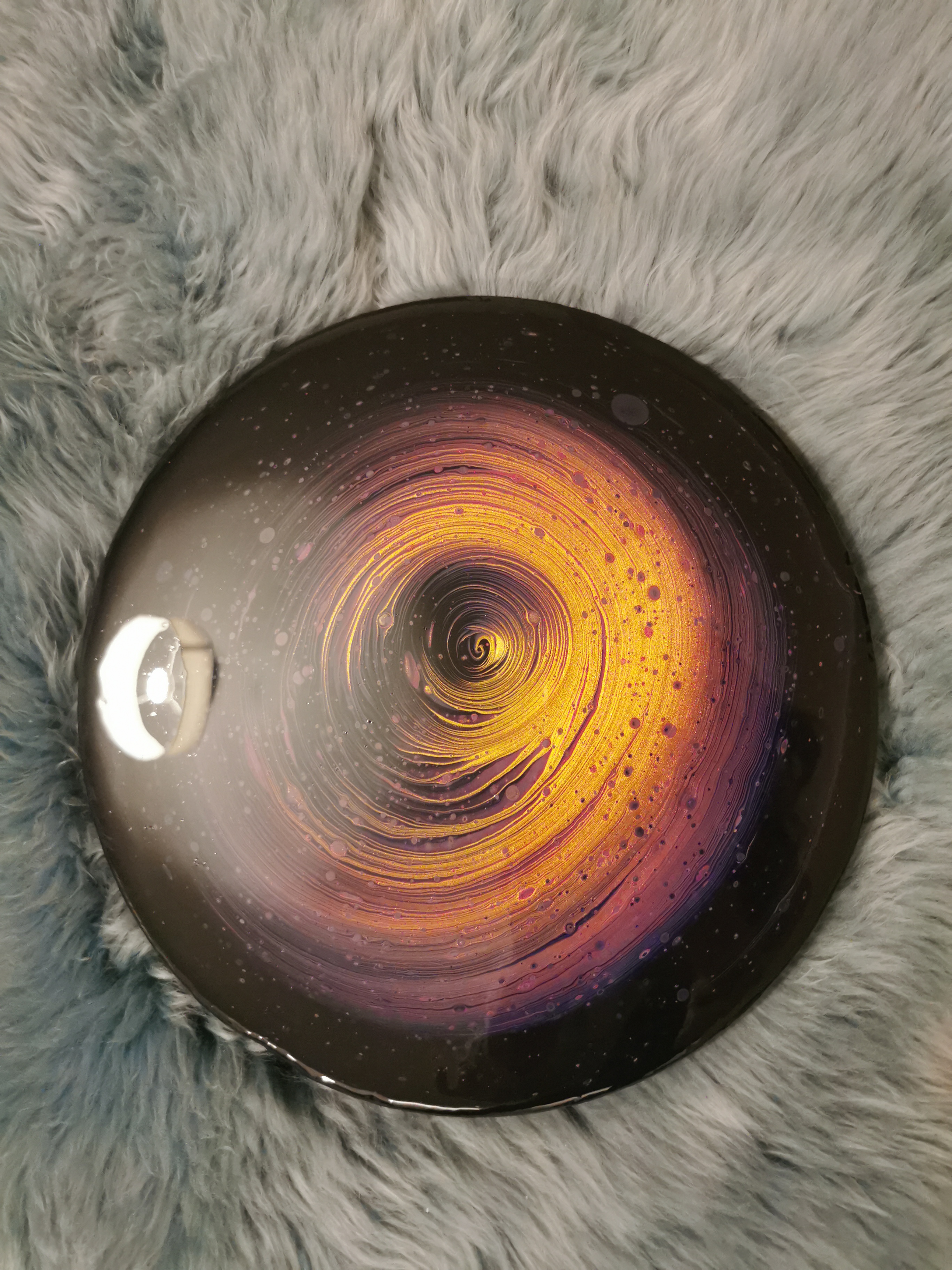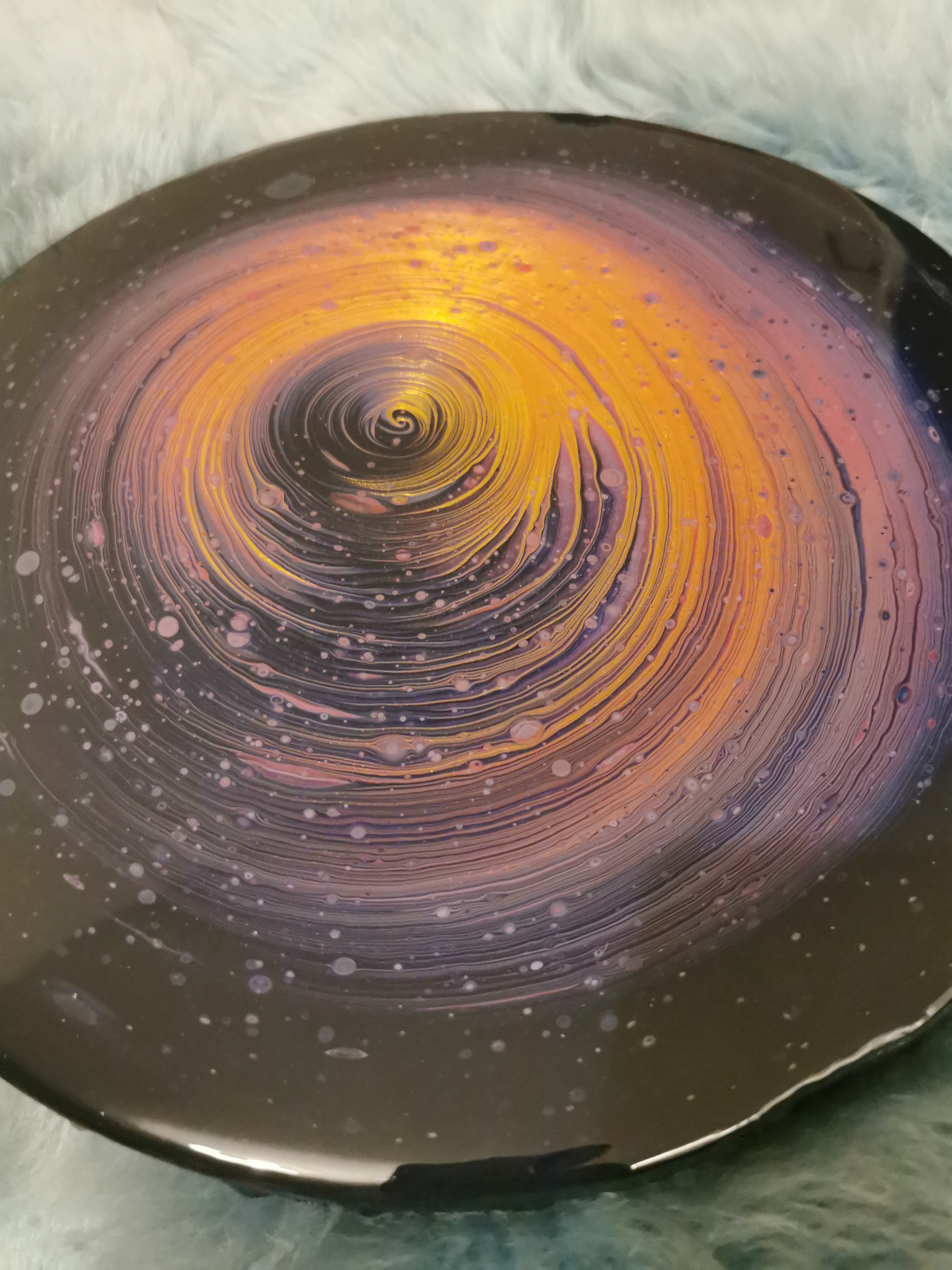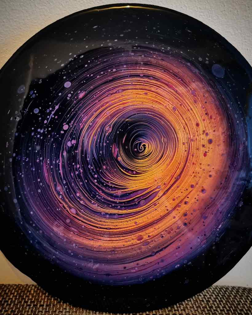 Enter a world beyond your wildest imagination with our mesmerizing canvas. This round canvas, created using the unique acrylic pouring technique and topped with a layer of resin, captures the essence of an imaginary galaxy where gold is taking over everybody’s souls.