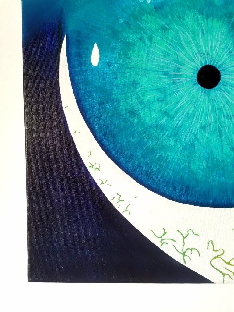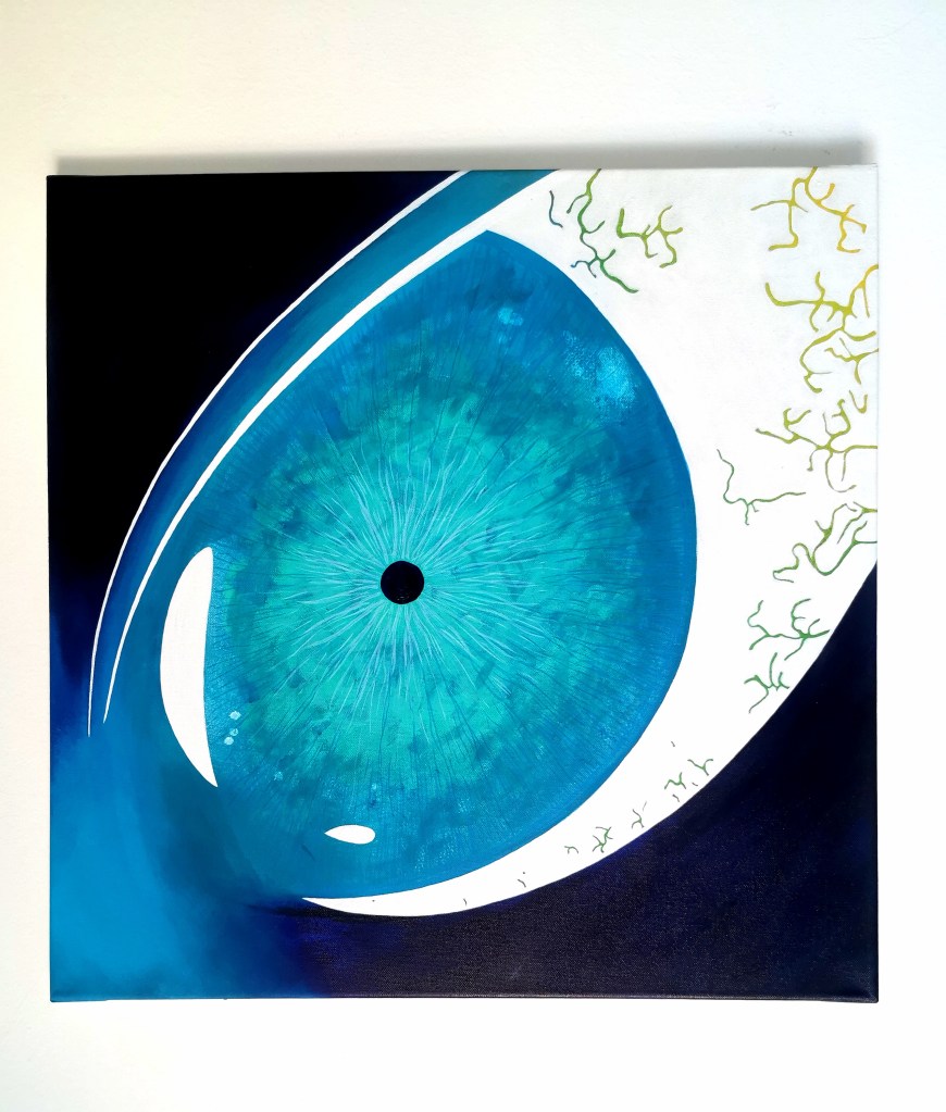 This piece is the result of an intuitive painting workshop with Christin Kirchner. When I picked up the paintbrush, I had no idea that I was about to spill my burnout onto the canvas. It started as something abstract, colorful. Soon I noticed it looked like an eye, so I focused on shaping it. I love the colors of the iris and how they blend, it definitely shows a depth of the soul. But look closely, and you’ll see yellow and green veins inside the eye. These veins stand for the illusion of balancing work (money) and life (nature).