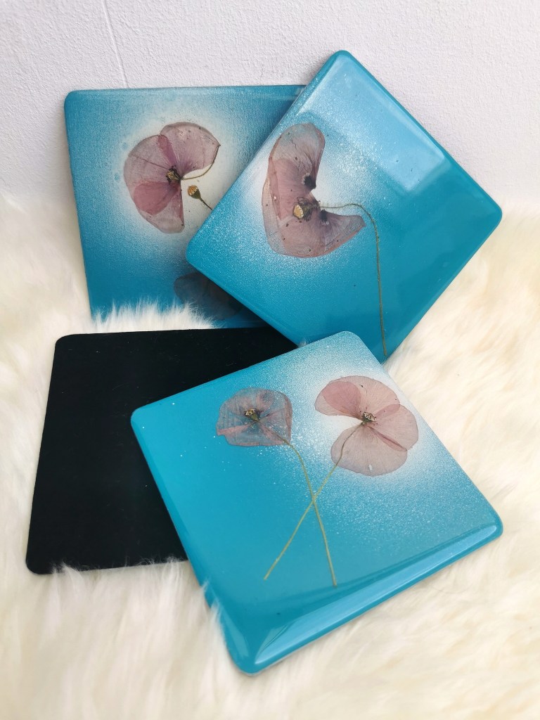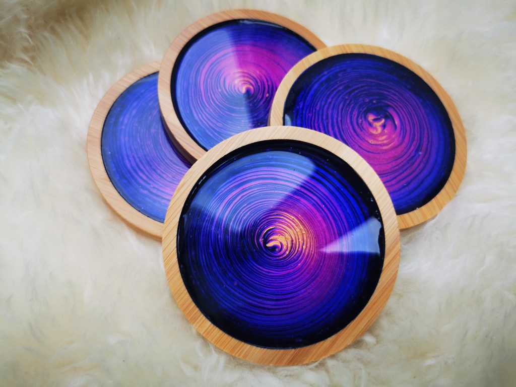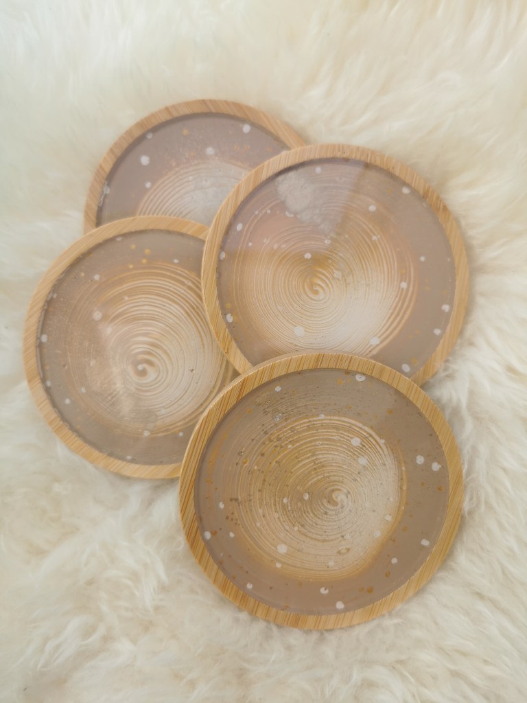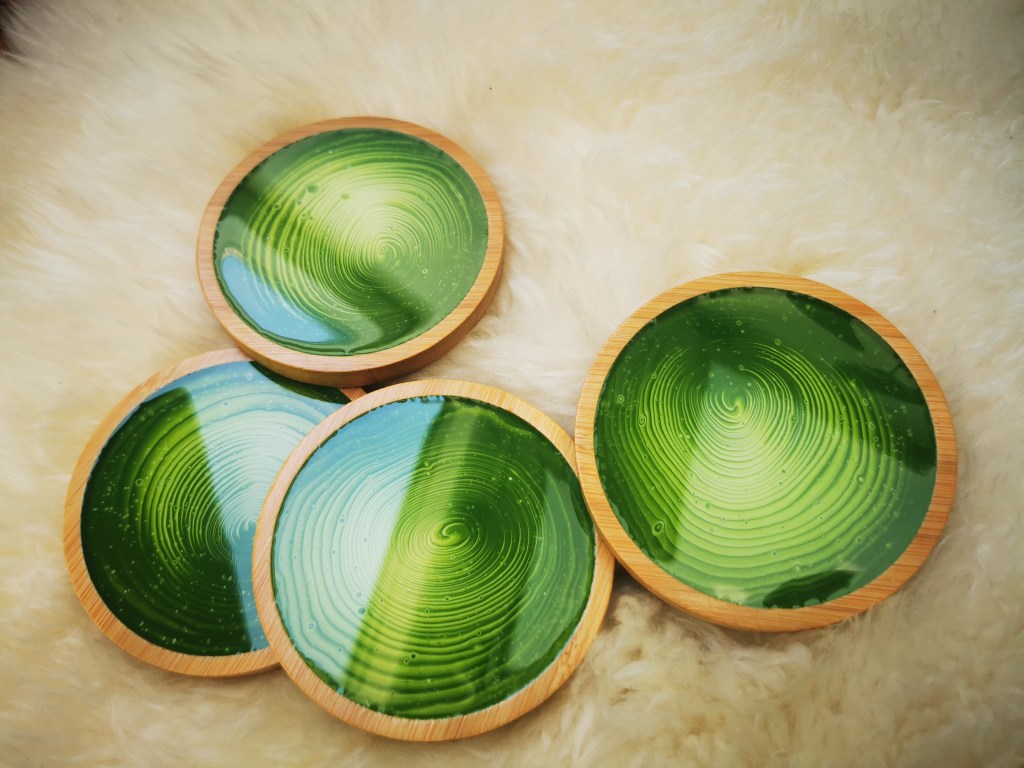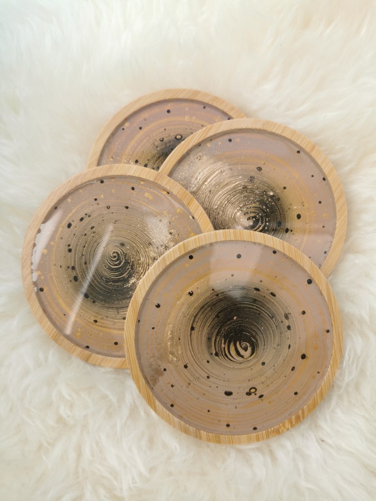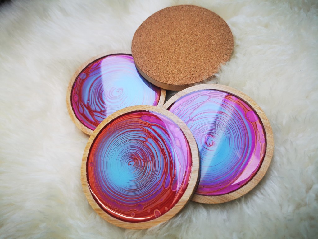 Wooden coasters with different patterns, resin top coat and cork or velvet base coat. 10 x 10 cm.