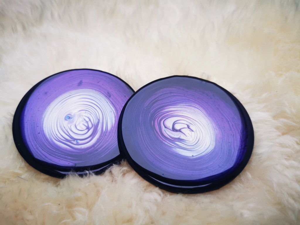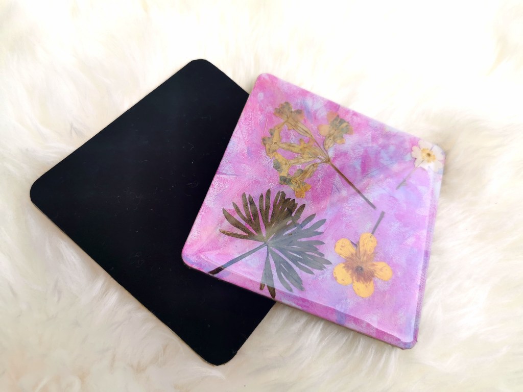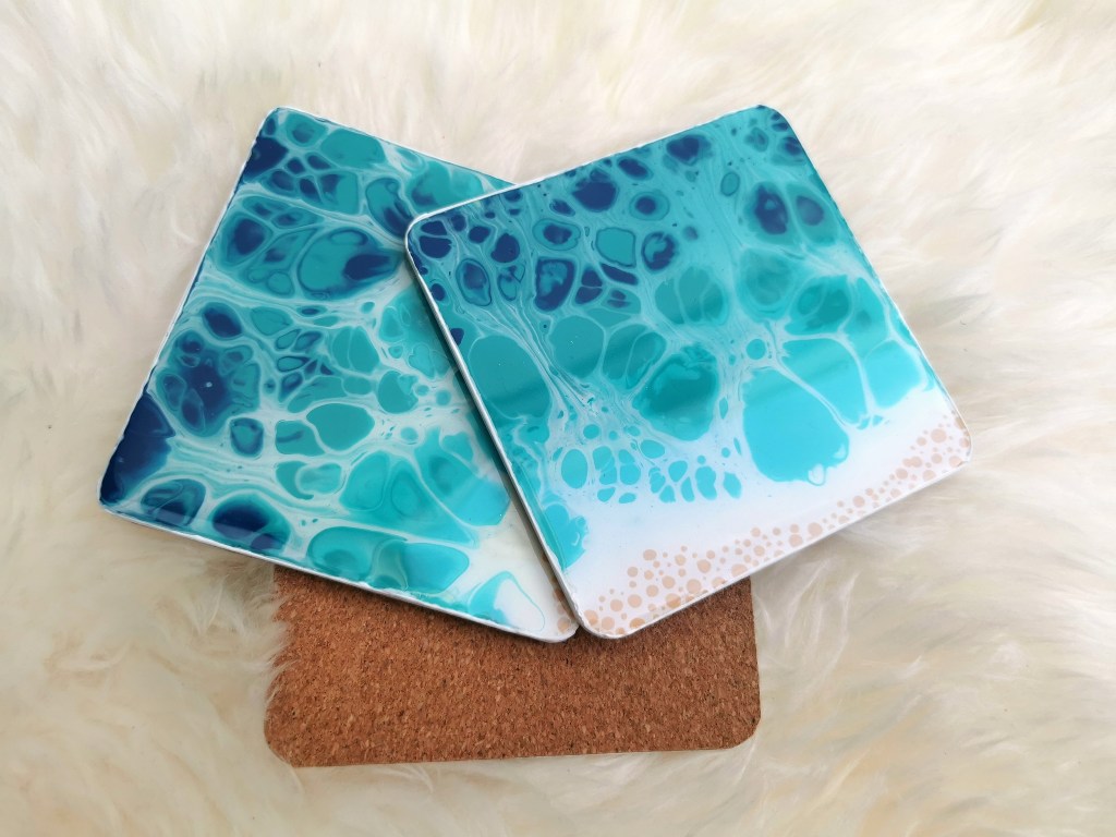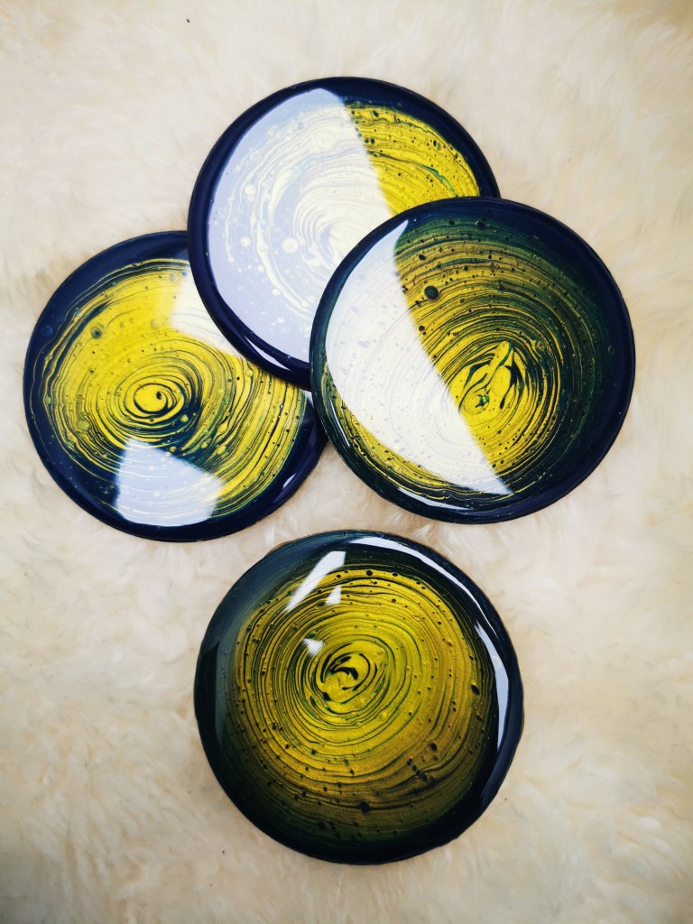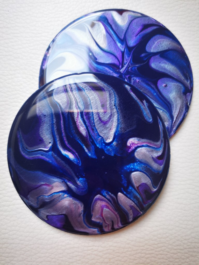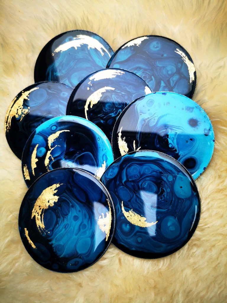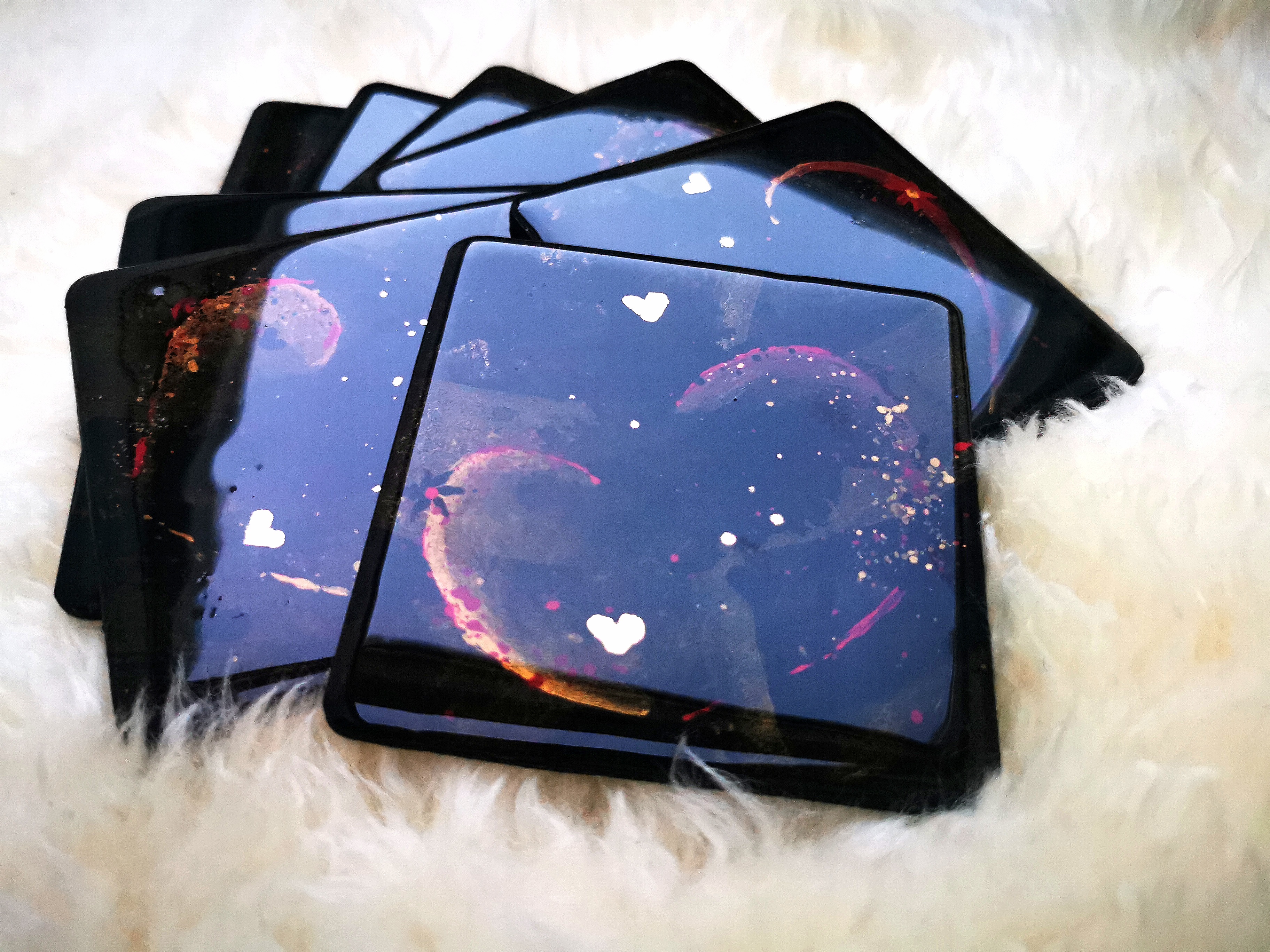Cardboard coasters with different patterns, resin top coat and cork or velvet base coat. 10 x 10 cm.