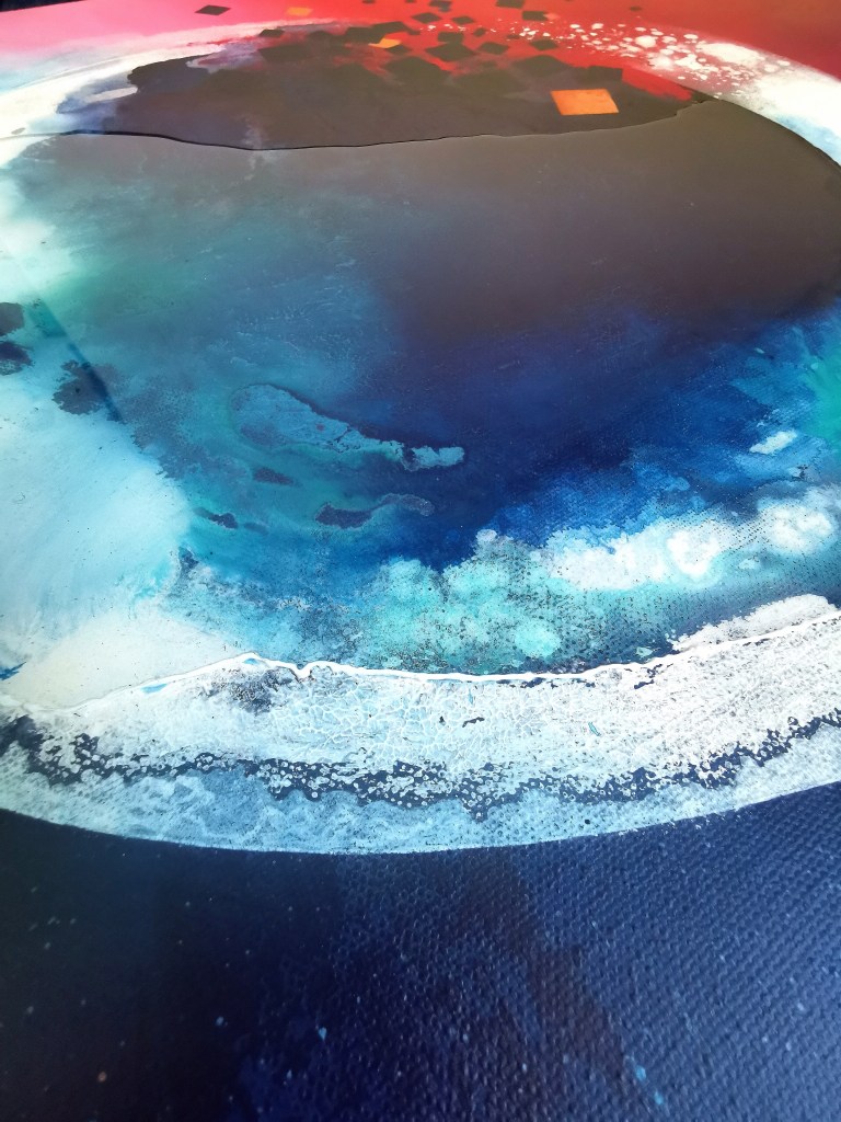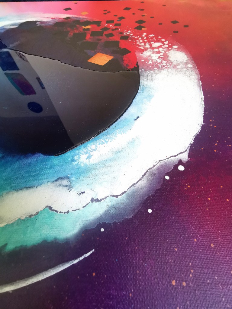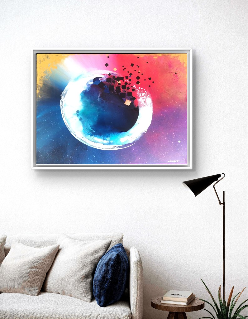Does this painting depict the end of the world, with the planet disintegrating, or the miraculous moment when all the pieces come back together? It captures a delicate balance between destruction and rebirth suggesting that each ending is also a new beginning. Trust the process and continue to rule the world!