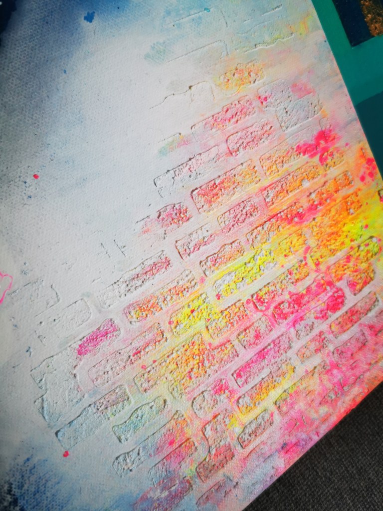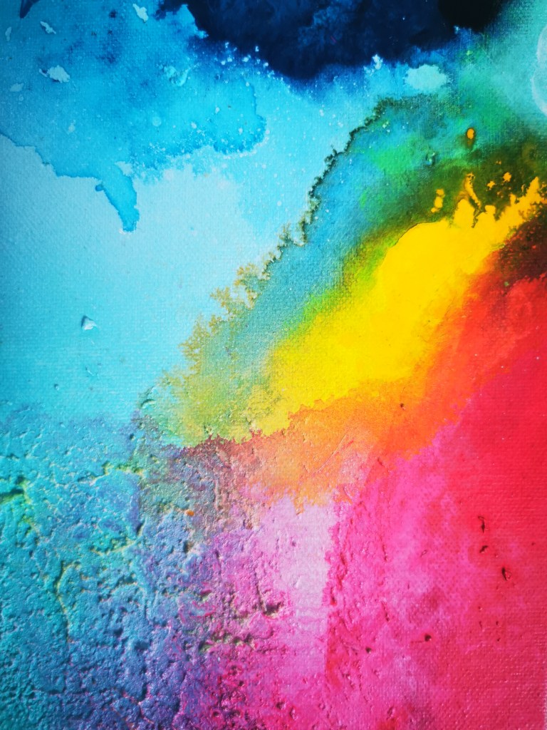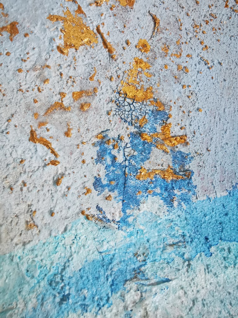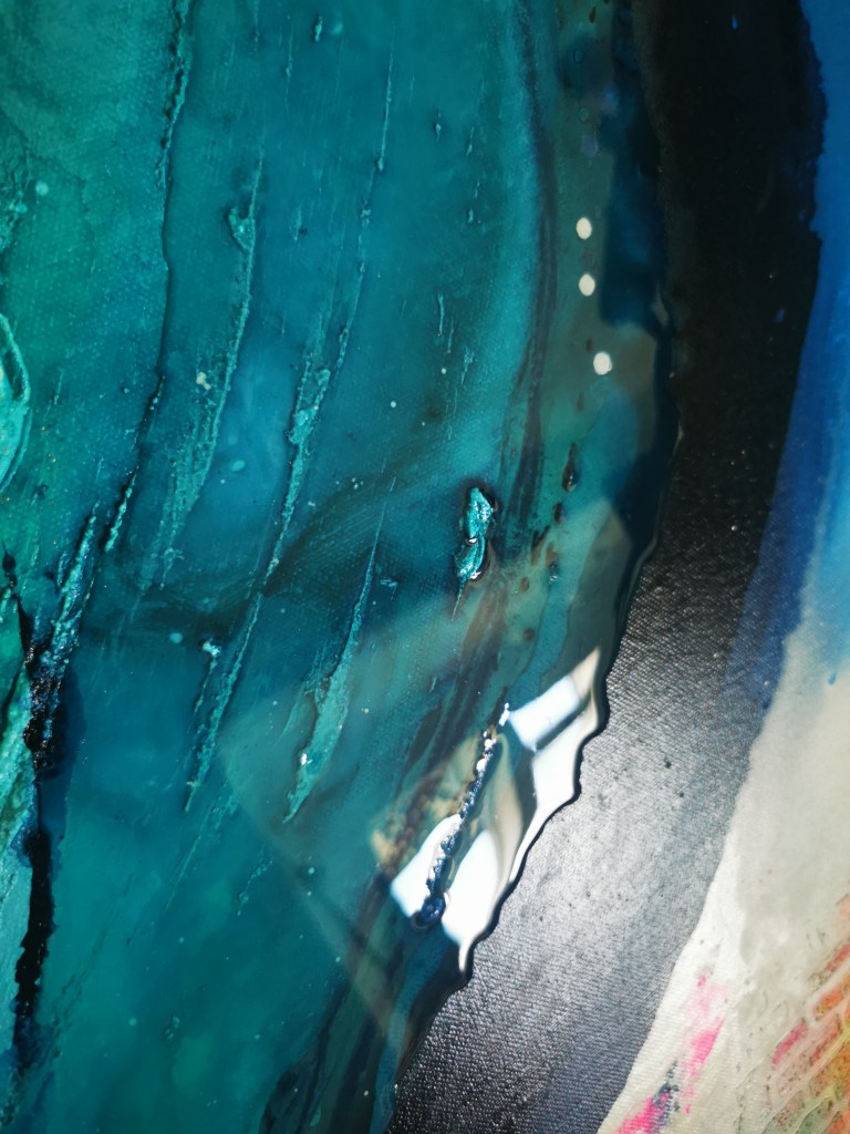 1 m x 1 m Acrylic painting with different type of textures, golden leaf, resin touch, neon accents.