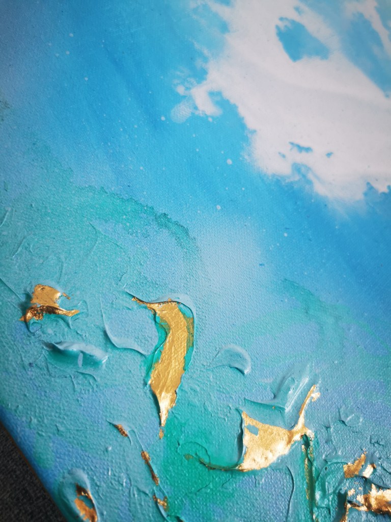 The four classical elements come alive in this piece: the depth of water shimmers under a glossy resin coat, highlighting the serene turquoise below; the lightness of air is evoked through airy, bubbly strokes of white and blue acrylics; the passion of fire burns within the heart motif; and the solidity of earth is grounded in the depiction of a planet.