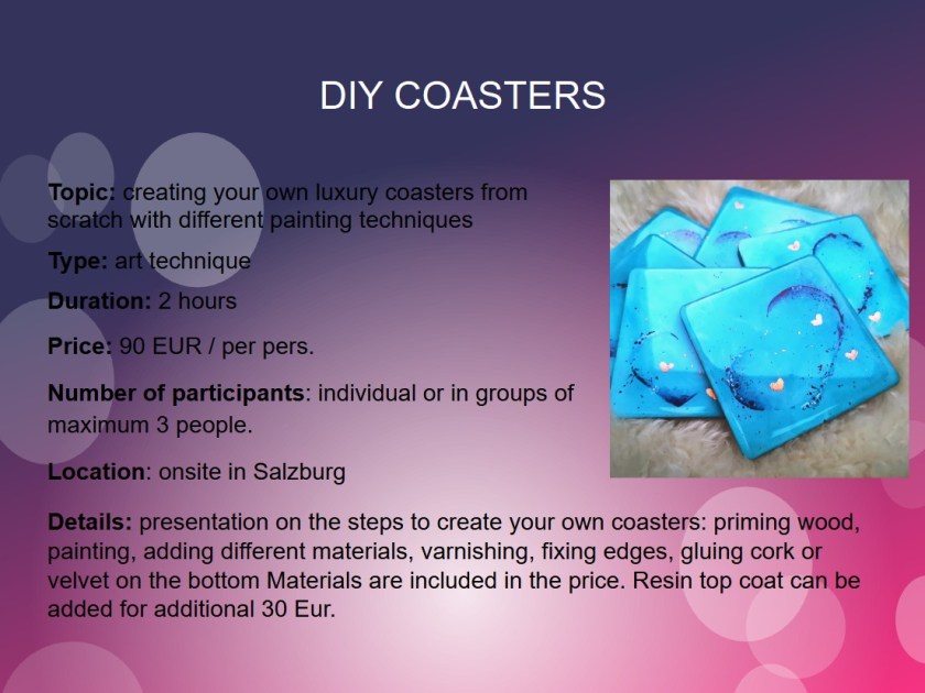 Starting in March 2025, I am excited to offer a series of workshops designed to awaken your creativity and provide therapeutic benefits. Whether you’re interested in exploring the vibrant world of acrylic pouring, crafting personalized coasters, or engaging in art therapy sessions, there’s a workshop tailored for you. To book your spot, please fill out the registration form.
